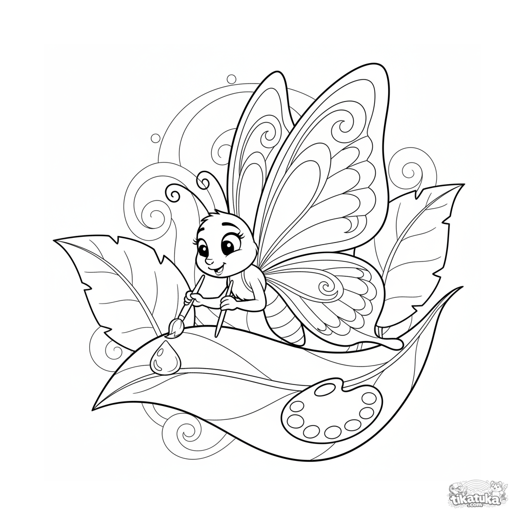 Ausmalbild für 7-9 Jahre: eine anmutige Schmetterlings-Künstlerin malt auf einer Tautropfen-Leinwand auf einem großen Blatt. Kreative Szene.