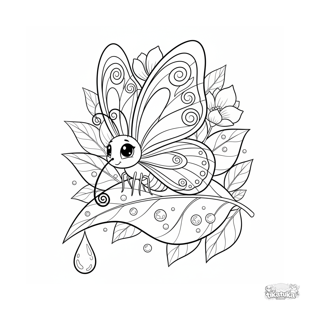 Ausmalbild für 7-9 Jahre im Jugendstil-Lite: Ein anmutiger Schmetterling mit gemusterten Flügeln trinkt Wasser aus einem Tautropfen.