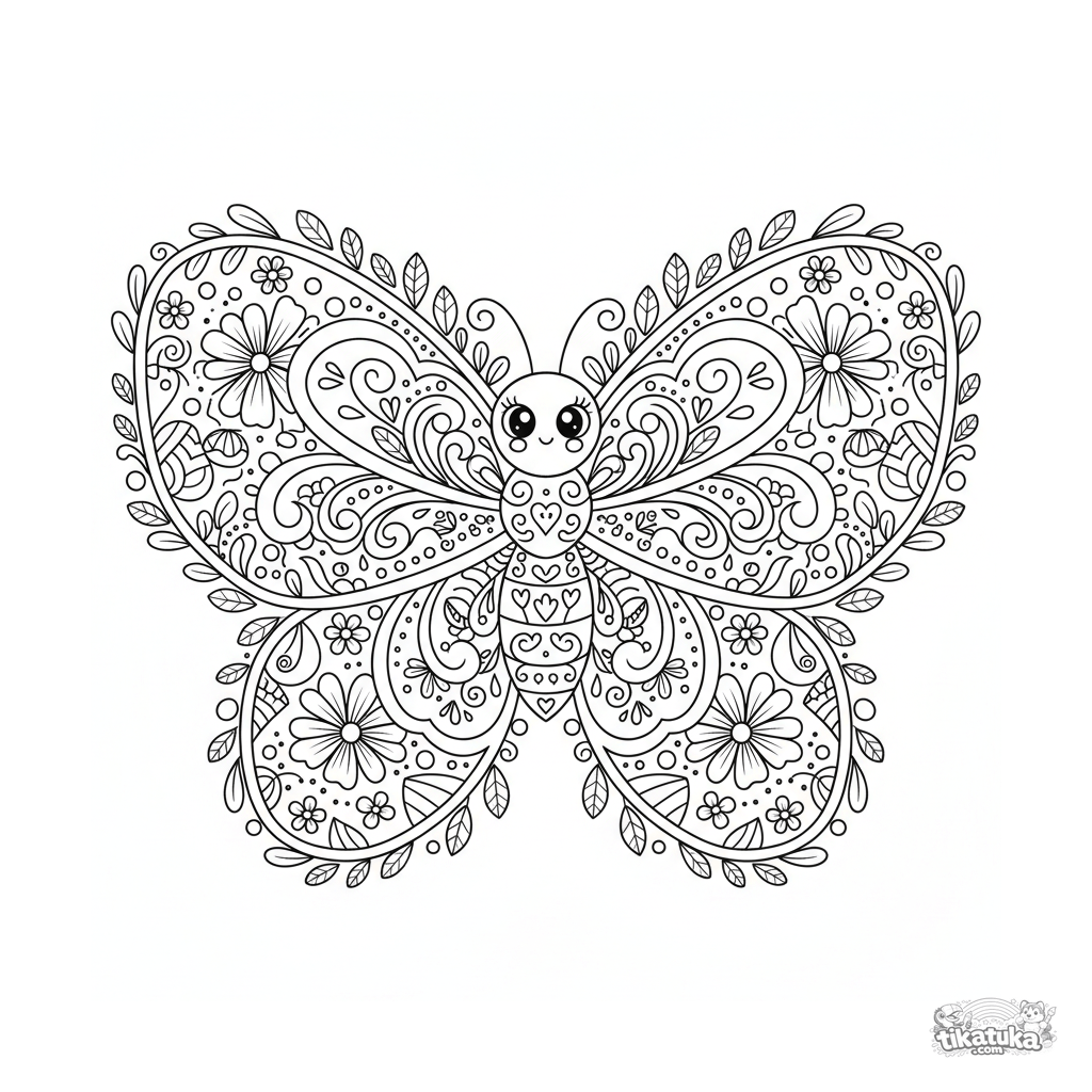 Detailliertes Schmetterlingsflügel-Mandala Ausmalbild für 10-12 Jahre. Schmetterlingskörper in der Mitte, symmetrische Flügel mit Blumenmustern und blattreicher Rand.