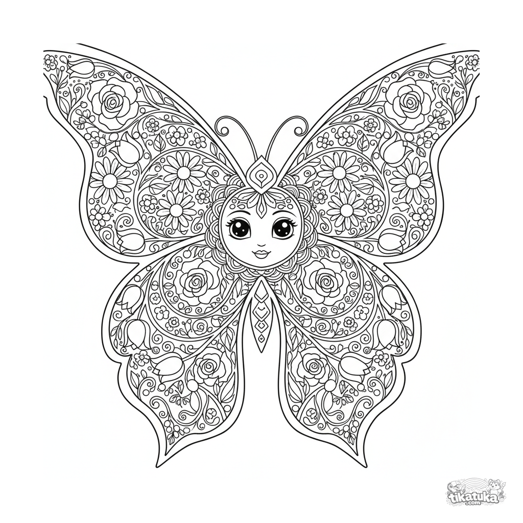 Einzigartiges Mandala-Ausmalbild in Form eines Schmetterlingsflügels, gefüllt mit Blumen und Blättern. Ein komplexes symmetrisches botanisches Muster für Kinder von 10-12 Jahren, inspiriert vom Jugendstil.