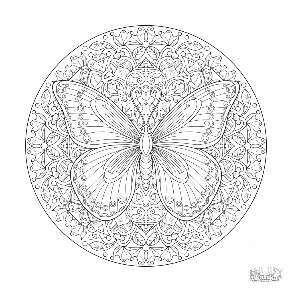 Hochdetailliertes Schmetterlingsflügel-Mandala Ausmalbild für Kinder von 10-12 Jahren. Flügel sind mit komplexen symmetrischen Mustern gefüllt. Eine anspruchsvolle Ausmalaufgabe.