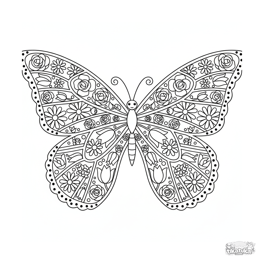 Detailliertes Schmetterlingsflügel-Mandala-Ausmalbild für 10-12 Jahre. Zentraler Körper, gespiegelte Flügel, unterteilt in Fächer mit verschiedenen Blumenmustern. Ein komplexes, perfekt symmetrisches Design für Naturliebhaber.