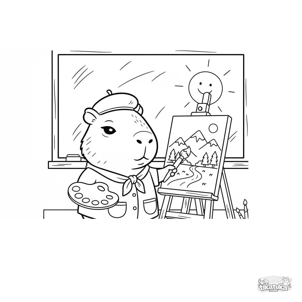Ausmalbild für Kinder 7-9: Ein ruhiges Capybara mit Baskenmütze malt ein Bild an einer Staffelei im Klassenzimmer. Mäßiges Detail, kreative Berufsszene.
