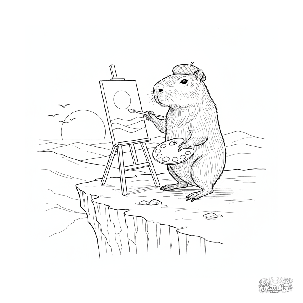 Detailliertes Ausmalbild für Kinder von 10-12 Jahren: Ein Capybara-Künstler malt den Sonnenuntergang an einer Staffelei auf einer Klippe. Aquarell-Skizzen-Stil.