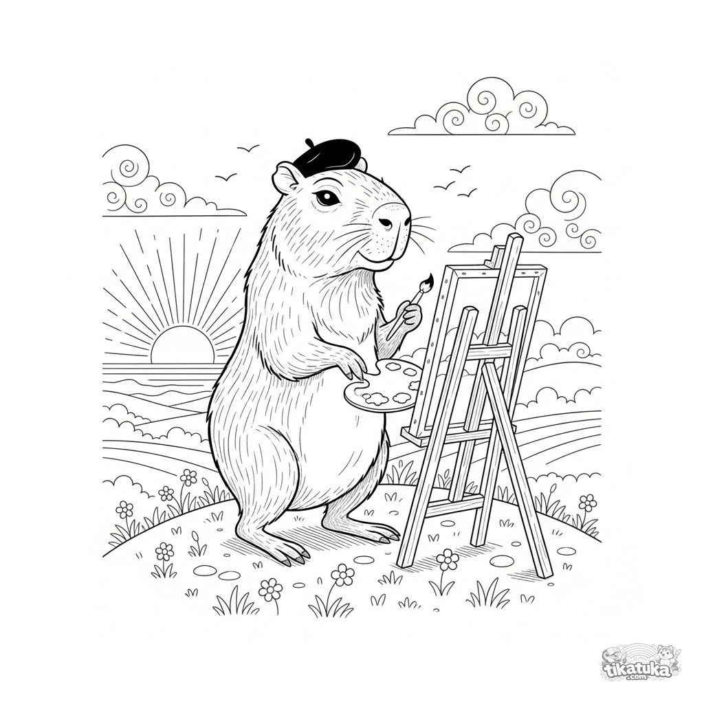 Detailliertes Ausmalbild für ältere Kinder 10-12: Ein Capybara-Künstler malt den Sonnenuntergang. Szene voller kreativer Details.