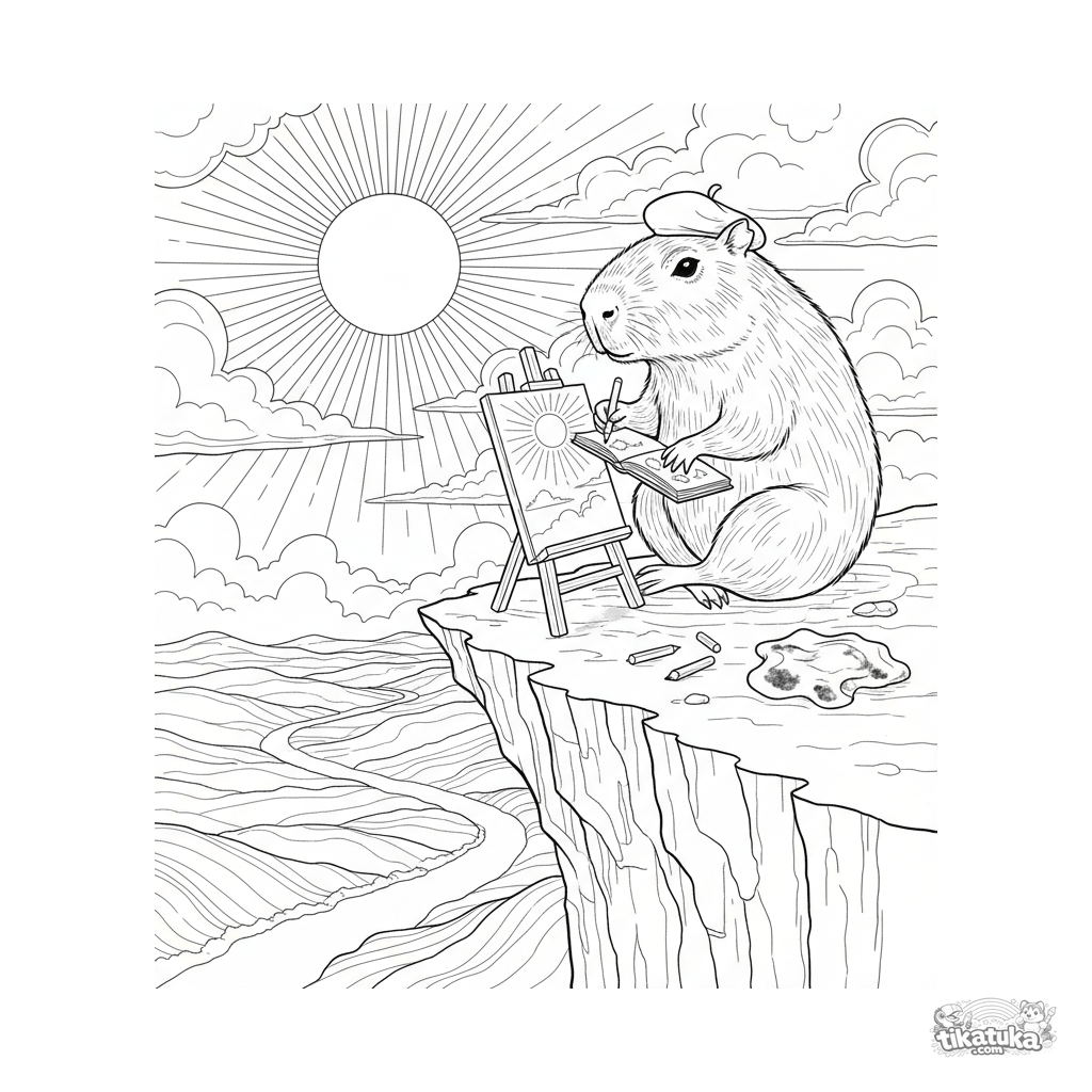 Detailliertes Ausmalbild für Kinder 10-12: Ein Capybara mit Baskenmütze skizziert den Sonnenuntergang an einer Staffelei.