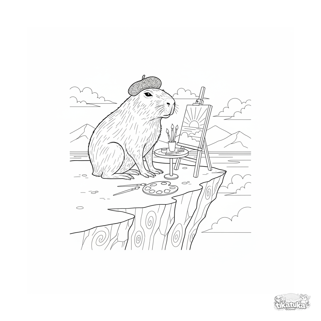 Detailliertes Ausmalbild eines Capybara-Künstlers, der den Sonnenuntergang auf einer Klippe malt. Szene der Kreativität für Kinder von 10-12 Jahren.