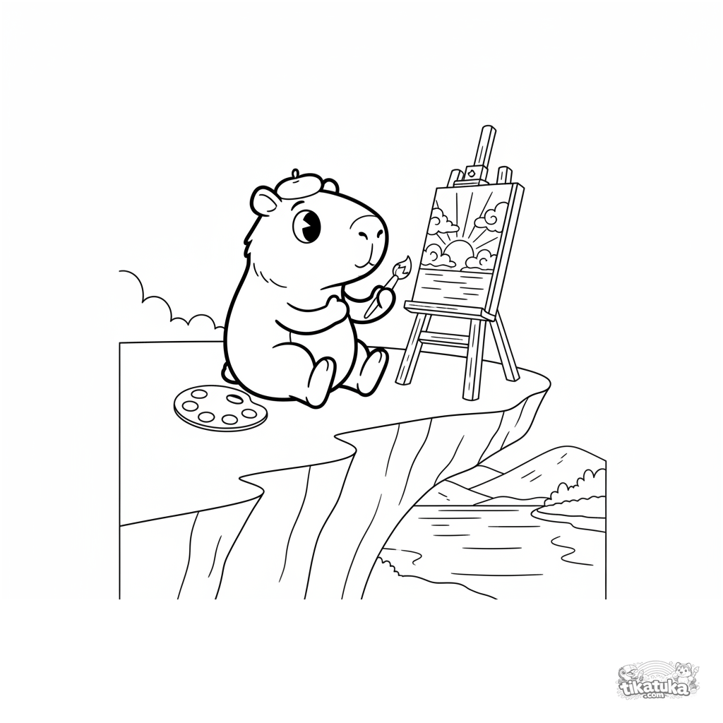 Ausmalbild: Ein Capybara mit Baskenmütze malt den Sonnenuntergang über einem See. Für Kinder von 7-9 Jahren. Szene mit Staffelei und Farben.