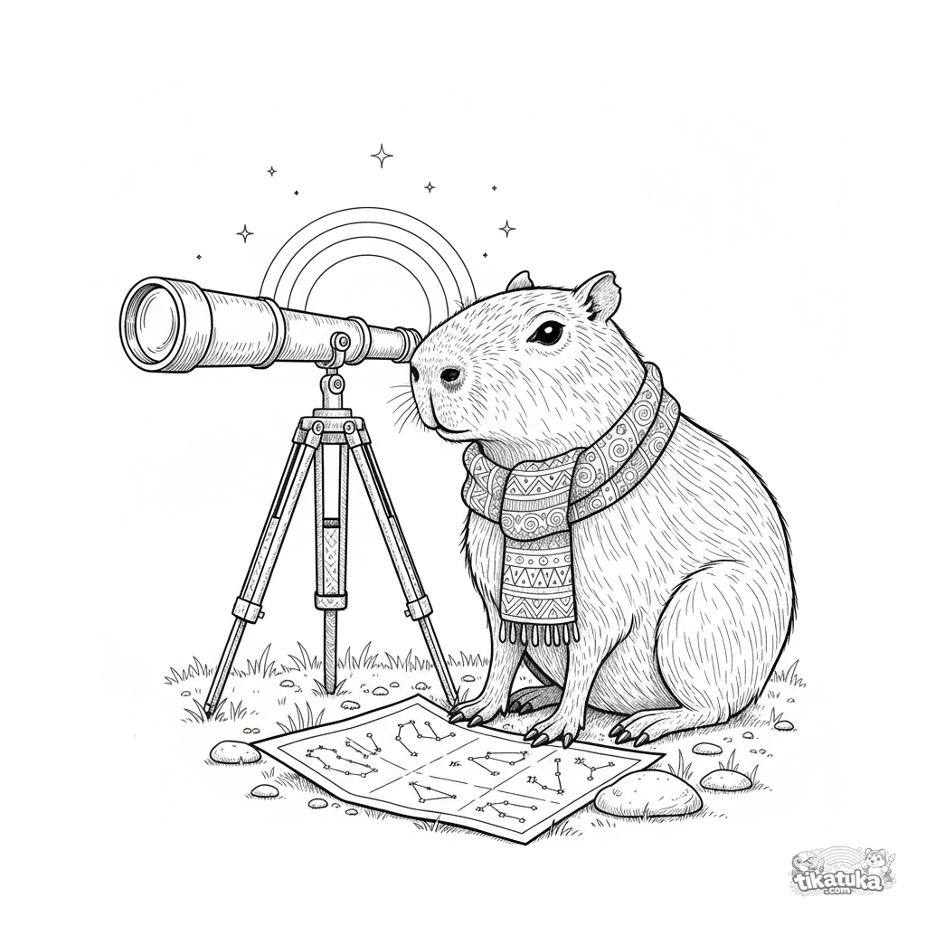 Detailliertes Ausmalbild für Kinder von 10-12 Jahren: ein Capybara-Astronom studiert die ersten Sterne beim Sonnenuntergang.