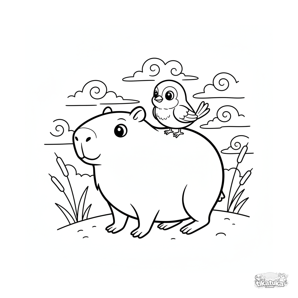 Ausmalbild für Kinder 4-6: Ein Capybara mit einem kleinen Vogel auf dem Rücken betrachtet den Sonnenuntergang. Szene ruhiger Freundschaft.