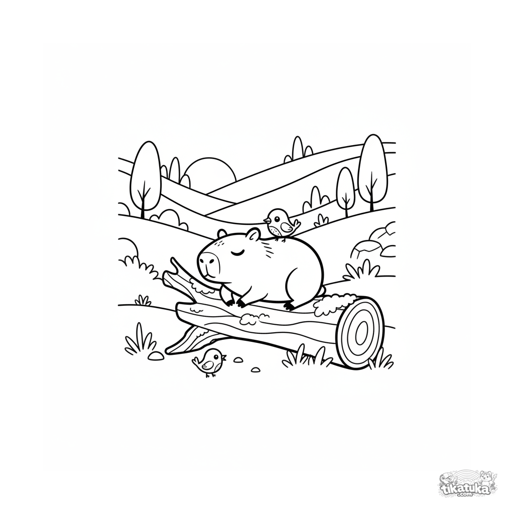 Ausmalbild eines Capybaras, das auf einem Baumstamm mit Vögeln beim Sonnenuntergang liegt. Szene der Freundschaft und Ruhe für Kinder von 7-9 Jahren.