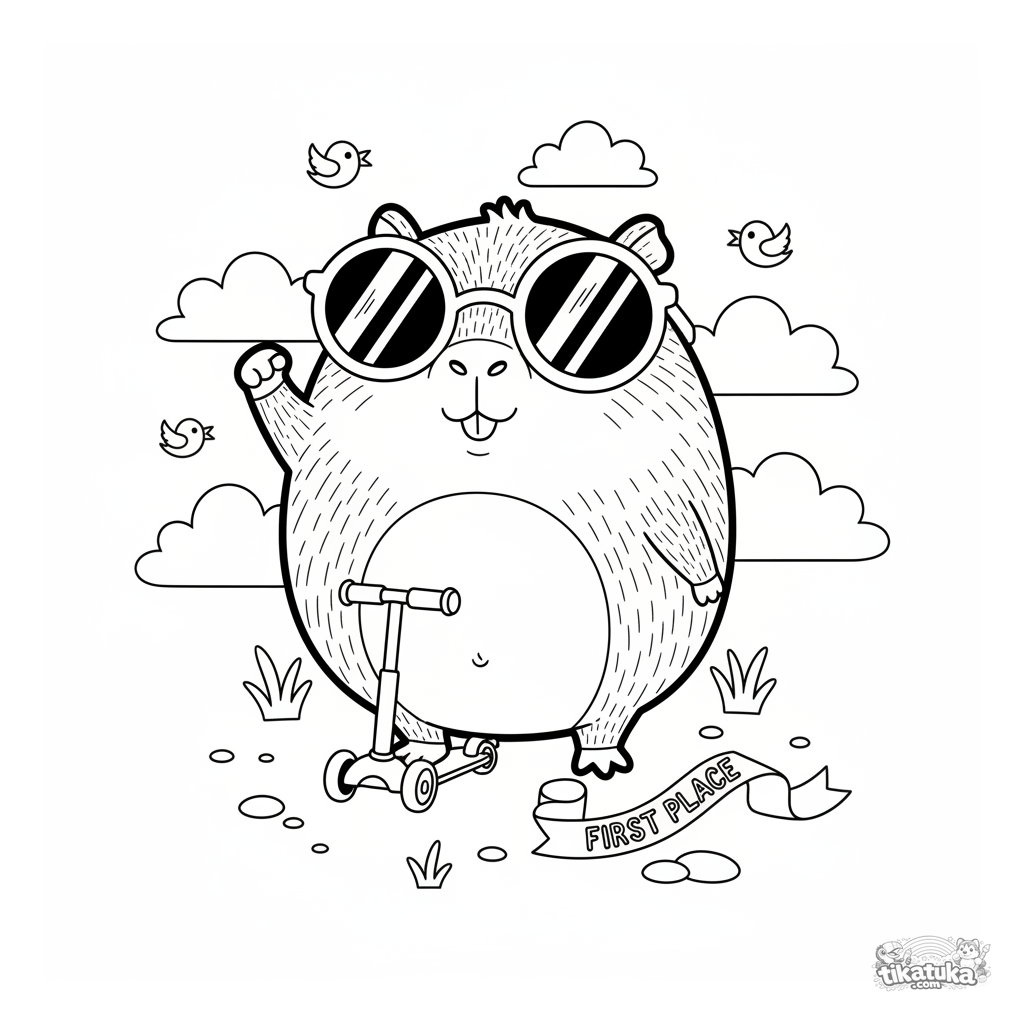 Ausmalbild für Kinder 7-12: eine übermütige Capybara mit Sonnenbrille feiert den Sieg neben einem winzigen Roller. Eine absurde und lustige Szene im Internet-Humor-Stil.