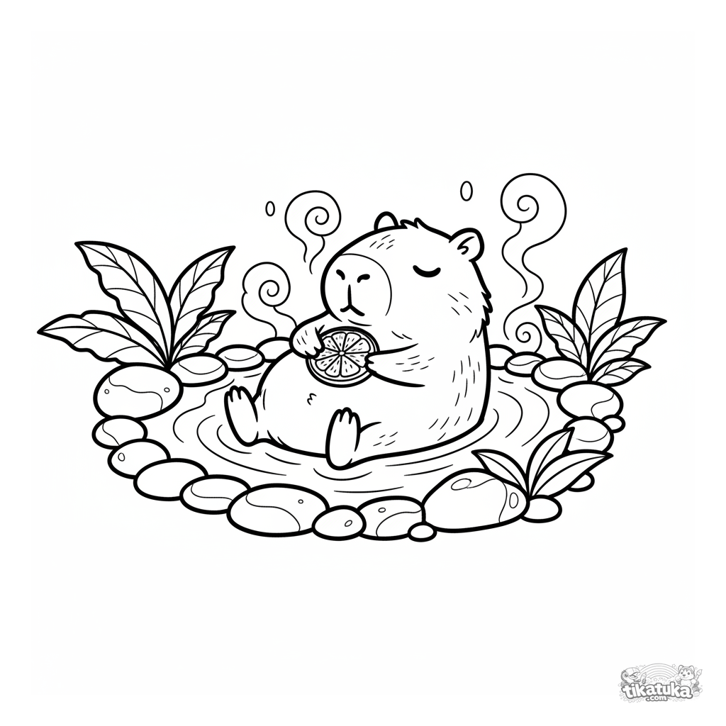 Detailliertes Ausmalbild für ältere Kinder 7-12: Ein Capybara in ultimativer Entspannung schwebt auf dem Rücken in einer Thermalquelle und balanciert eine Orangenscheibe auf seinem Bauch.