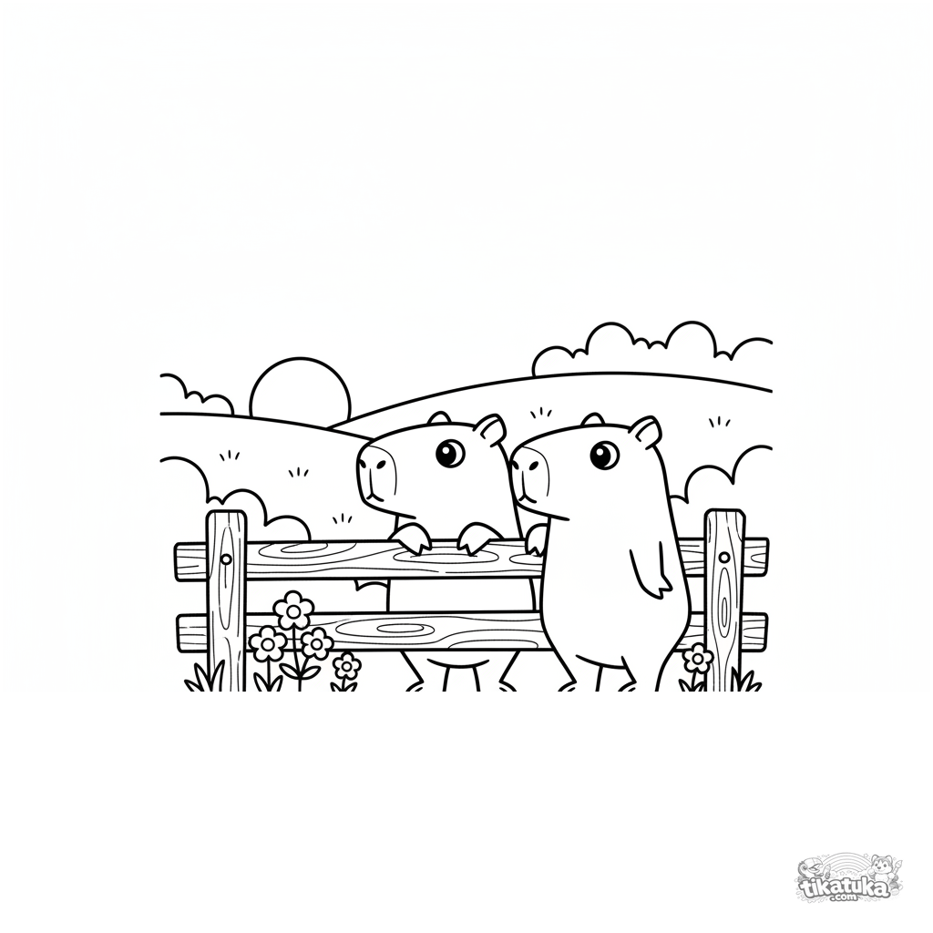 Ausmalbild für Kinder 7-9: Zwei Capybara-Freunde lehnen an einem Zaun und betrachten den Sonnenuntergang.