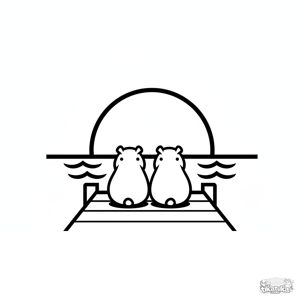 Ganz einfaches Ausmalbild für Kleinkinder 2-3: Zwei Capybara-Freunde sitzen auf einem Pier und schauen den Sonnenuntergang an. Große Formen, minimale Details.