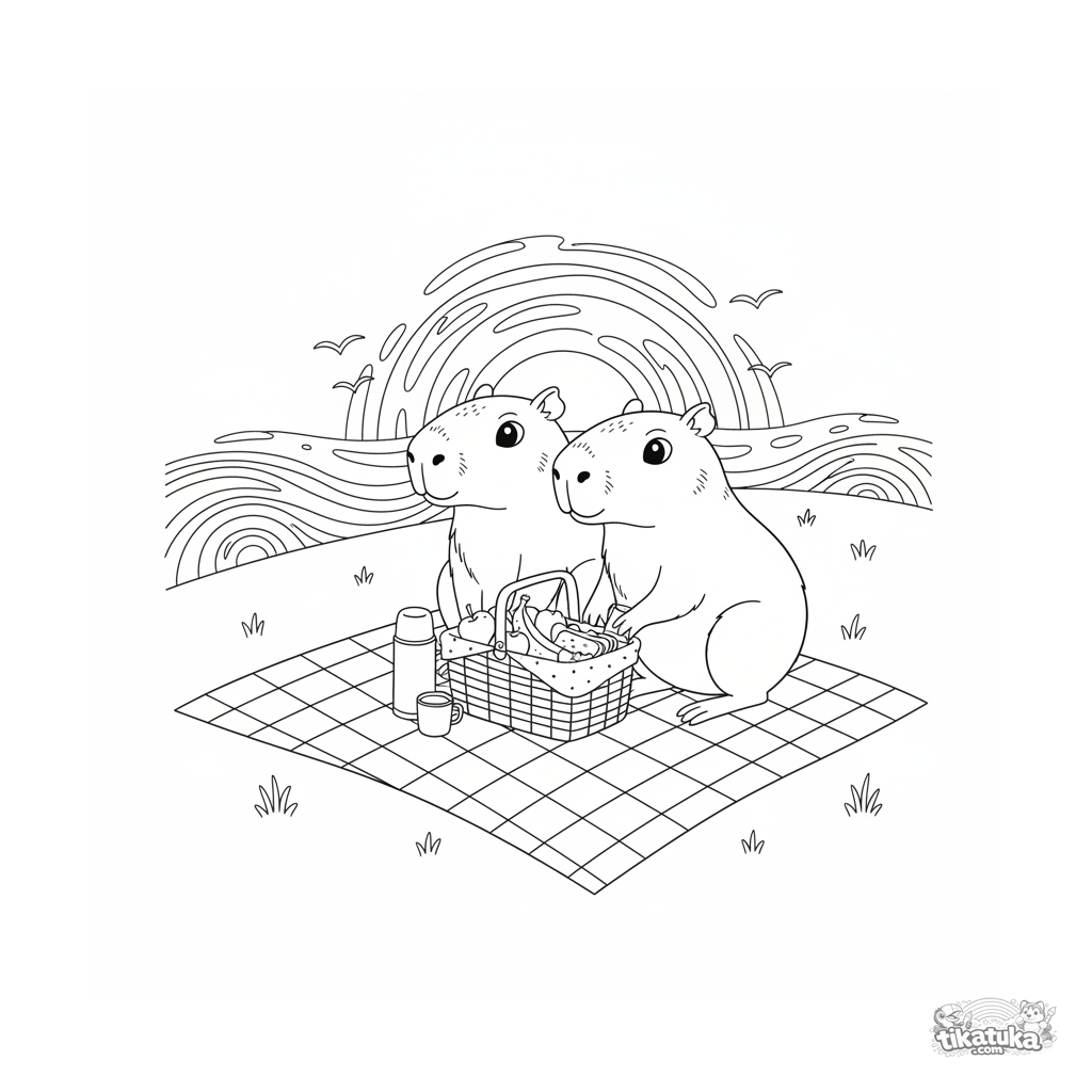Detailliertes realistisches Ausmalbild: Zwei Capybara-Freunde auf einem Picknick beobachten den Sonnenuntergang. Szene der Freundschaft und Gelassenheit für 10-12 Jahre.