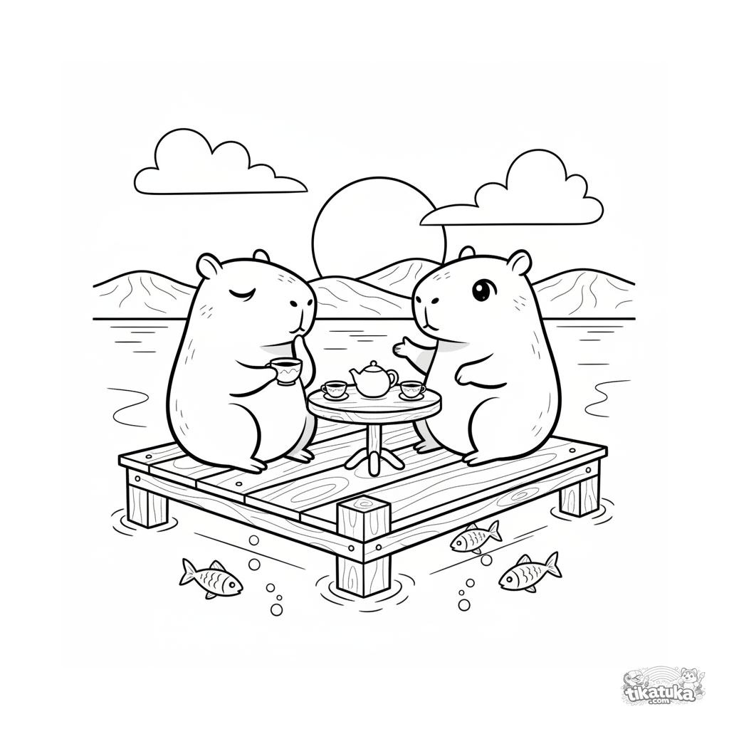 Ausmalbild für Kinder 7-9: zwei Capybara-Freunde trinken Tee auf einem Holzsteg und schauen dem Sonnenuntergang über einem See zu. Eine Szene der Freundschaft.