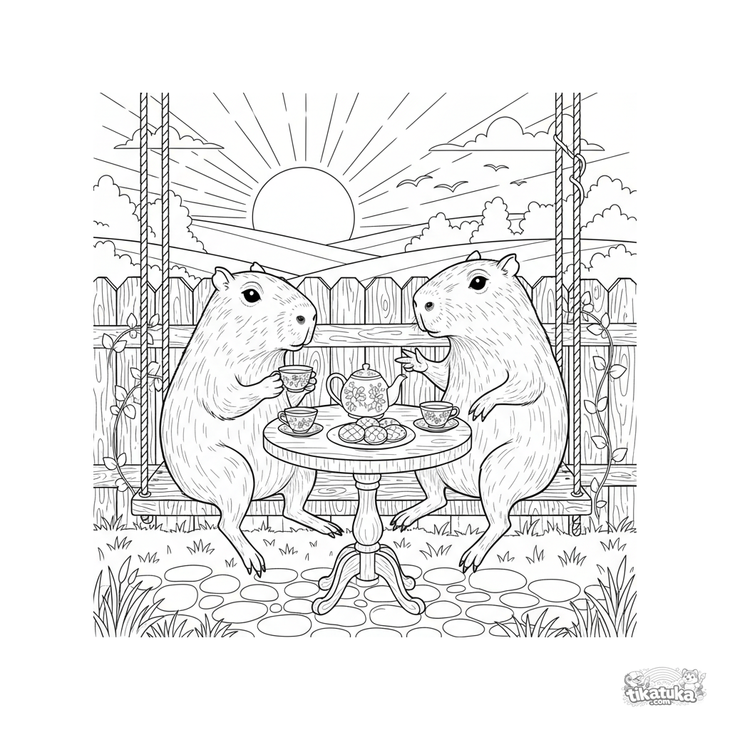Detailliertes Ausmalbild im Feldhandbuch-Stil: Zwei Capybaras teilen Tee auf einer Verandaschaukel bei Sonnenuntergang. Für 10-12 Jahre.