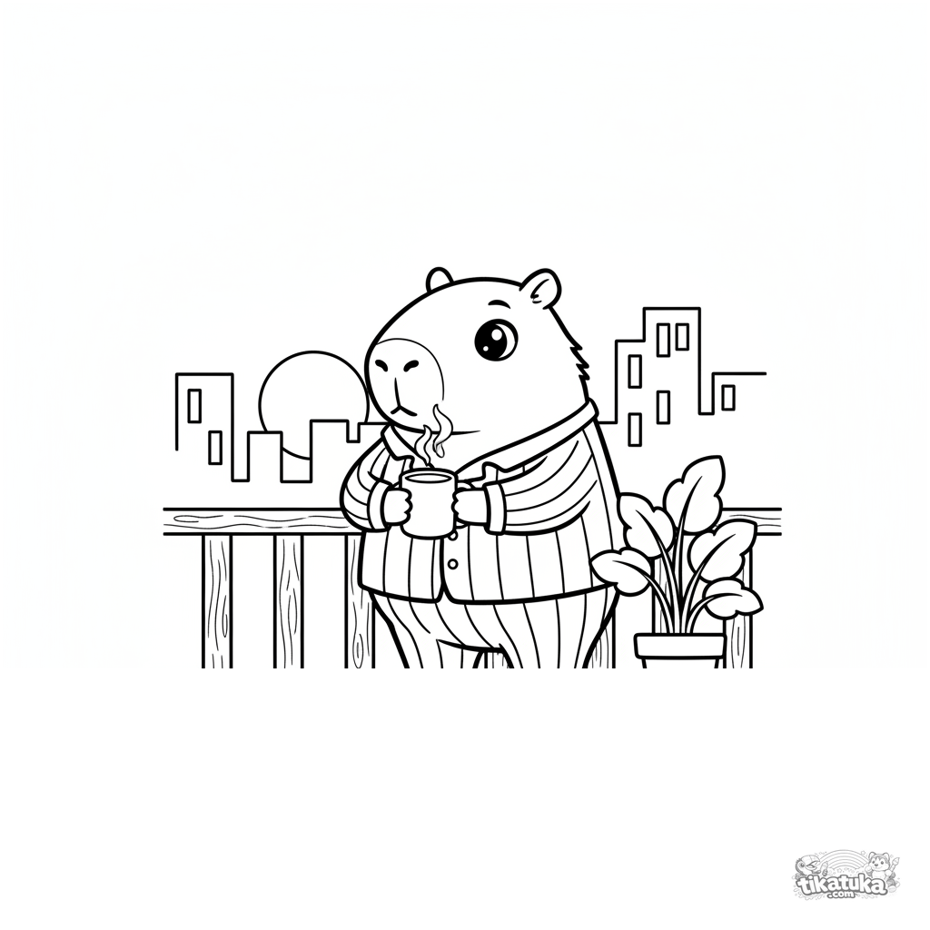 Ausmalbild für Kinder 7-9: Ein gemütliches Capybara im Schlafanzug mit einer Tasse auf dem Balkon schaut in den Stadtsonnenuntergang. Szene eines ruhigen Abends.