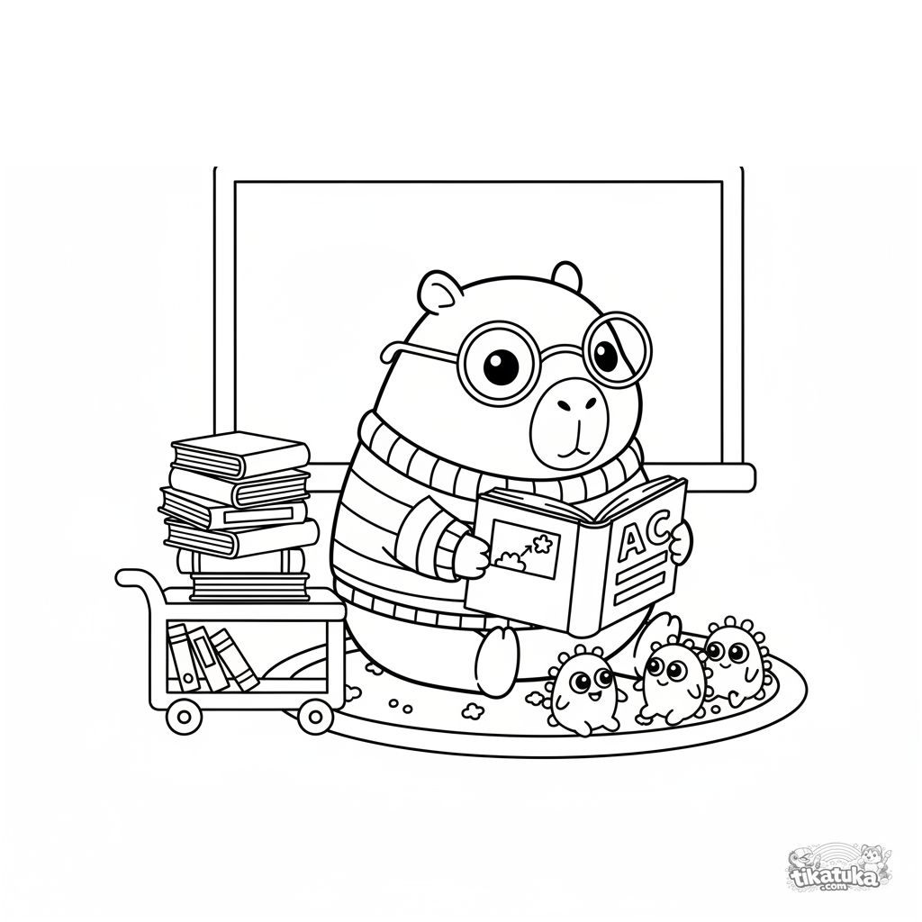 Ausmalbild für Kleinkinder 2-3: Eine entspannte Capybara mit Brille liest einem Mikroben-Publikum im gemütlichen Klassenzimmereck ein Buch vor.