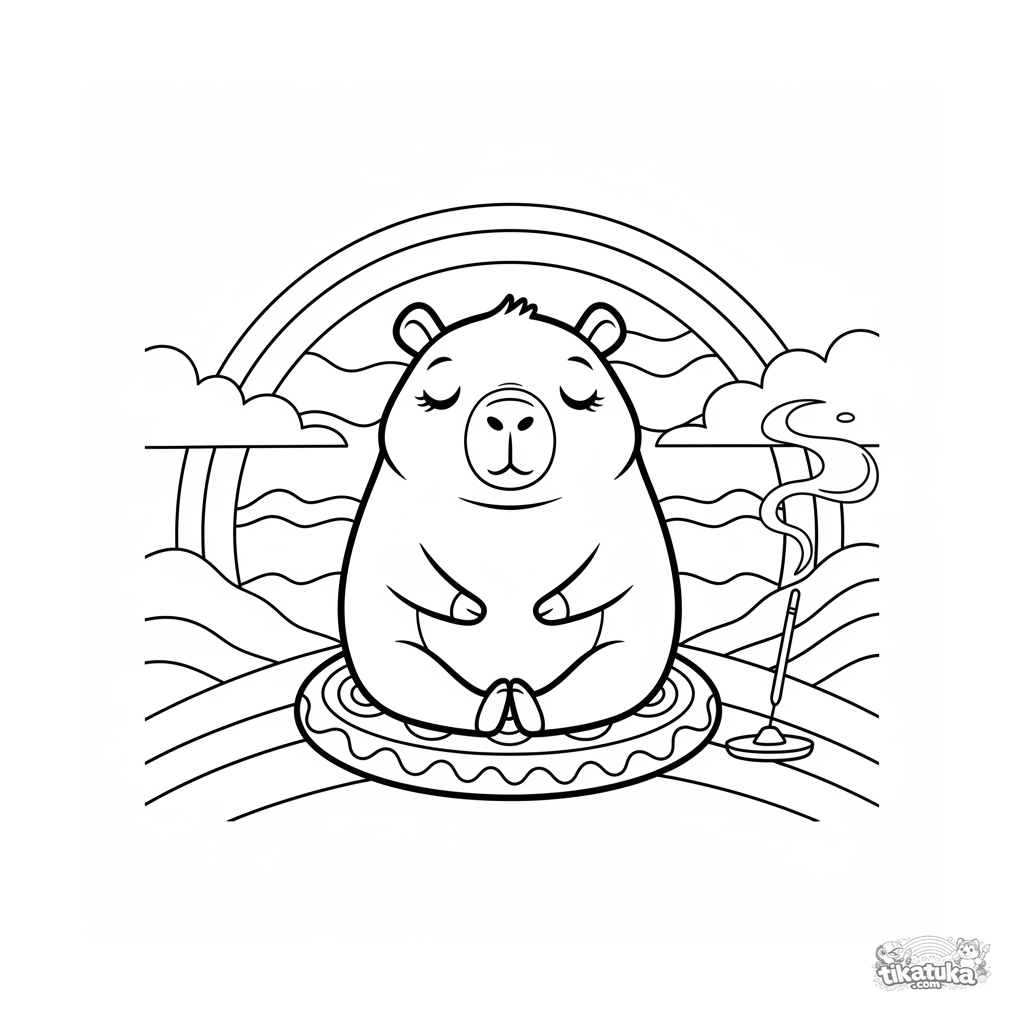 Ausmalbild für Kinder von 4-6 Jahren: Ein Capybara meditiert im Lotussitz auf einem Kissen auf einem Hügel vor Sonnenuntergang. Saubere, einfache Formen, mäßiges Detail.