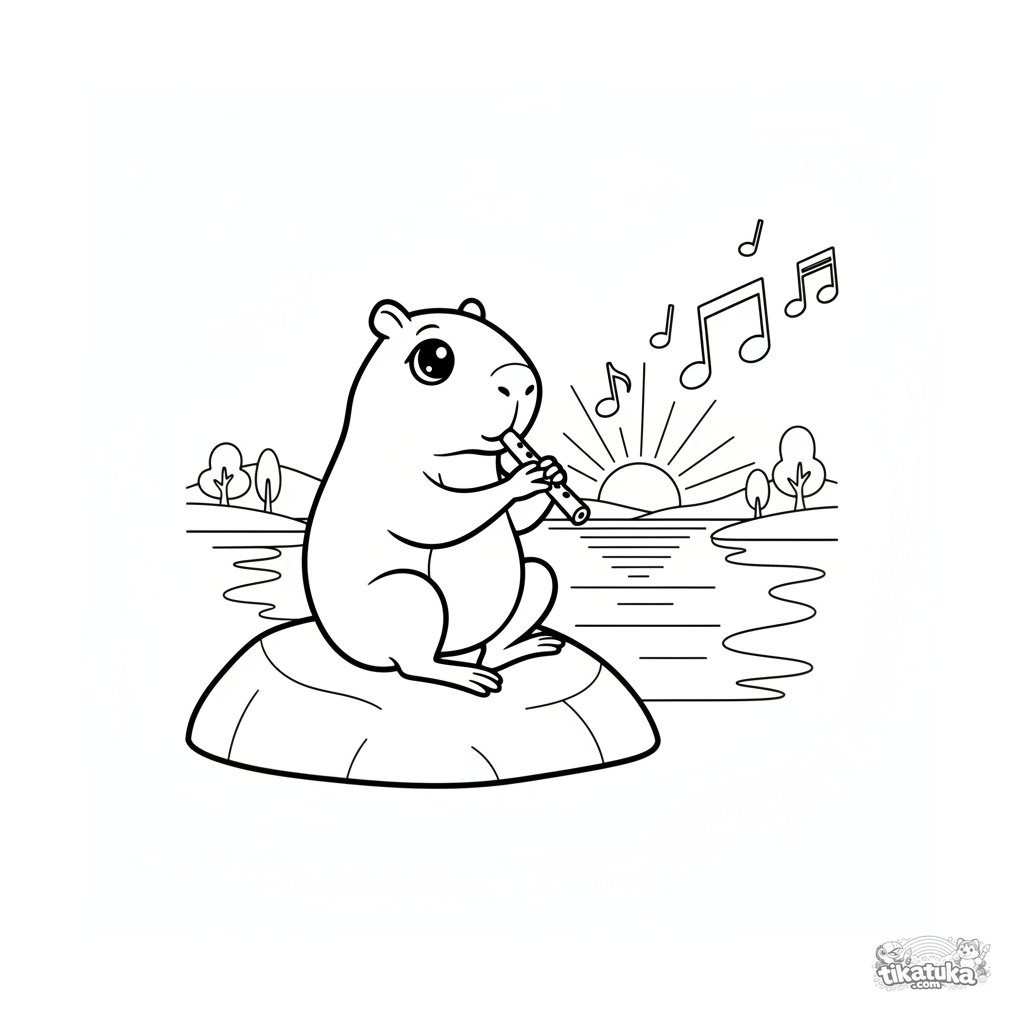 Ausmalbild für Kinder 7-9: Ein Capybara spielt auf einem Felsen am See Flöte bei Sonnenuntergang. Lockere Umrisse, atmosphärische Szene.
