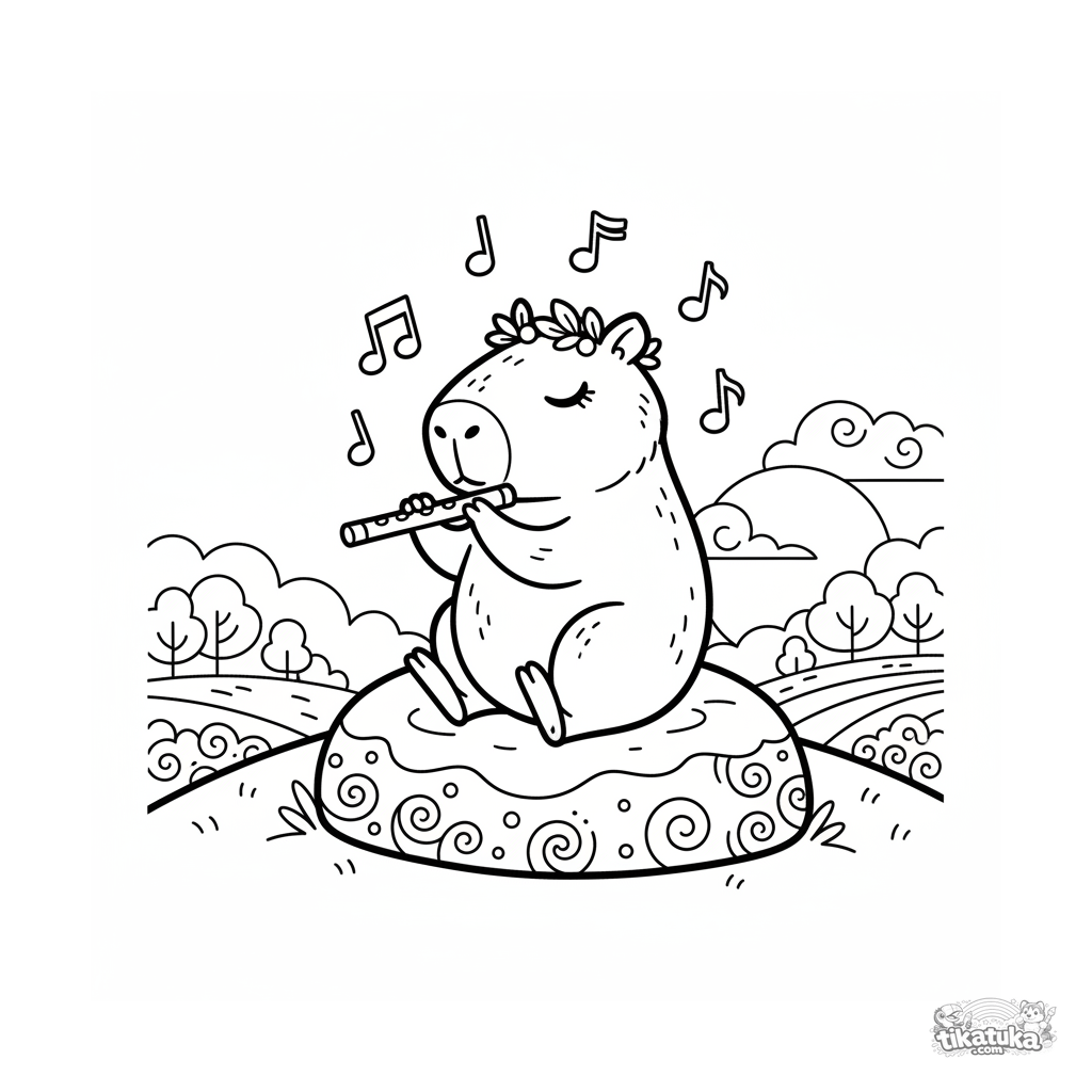 Ausmalbild im folkloristischen Stil für Kinder 4-6: Ein Capybara spielt Flöte bei Sonnenuntergang. Dekorative Noten und Blätterkrone.