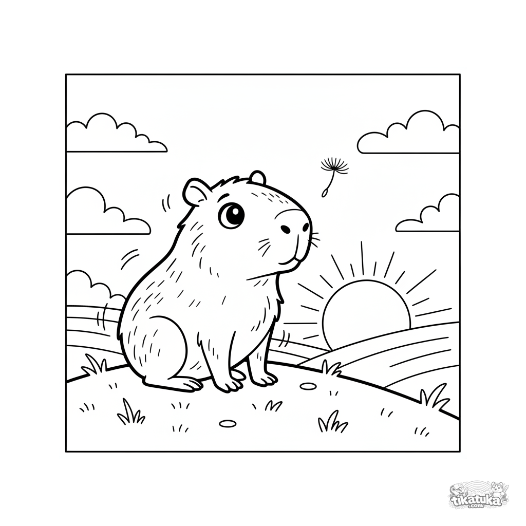 Ausmalbild eines Capybaras, das auf einem Hügel den Sonnenuntergang betrachtet. Szene der Ruhe und Kontemplation für Kinder von 7-9 Jahren.