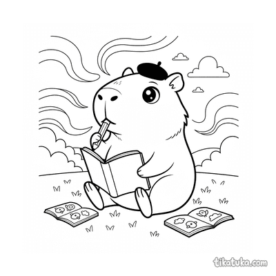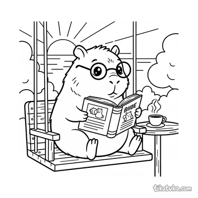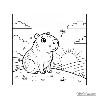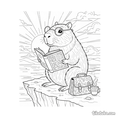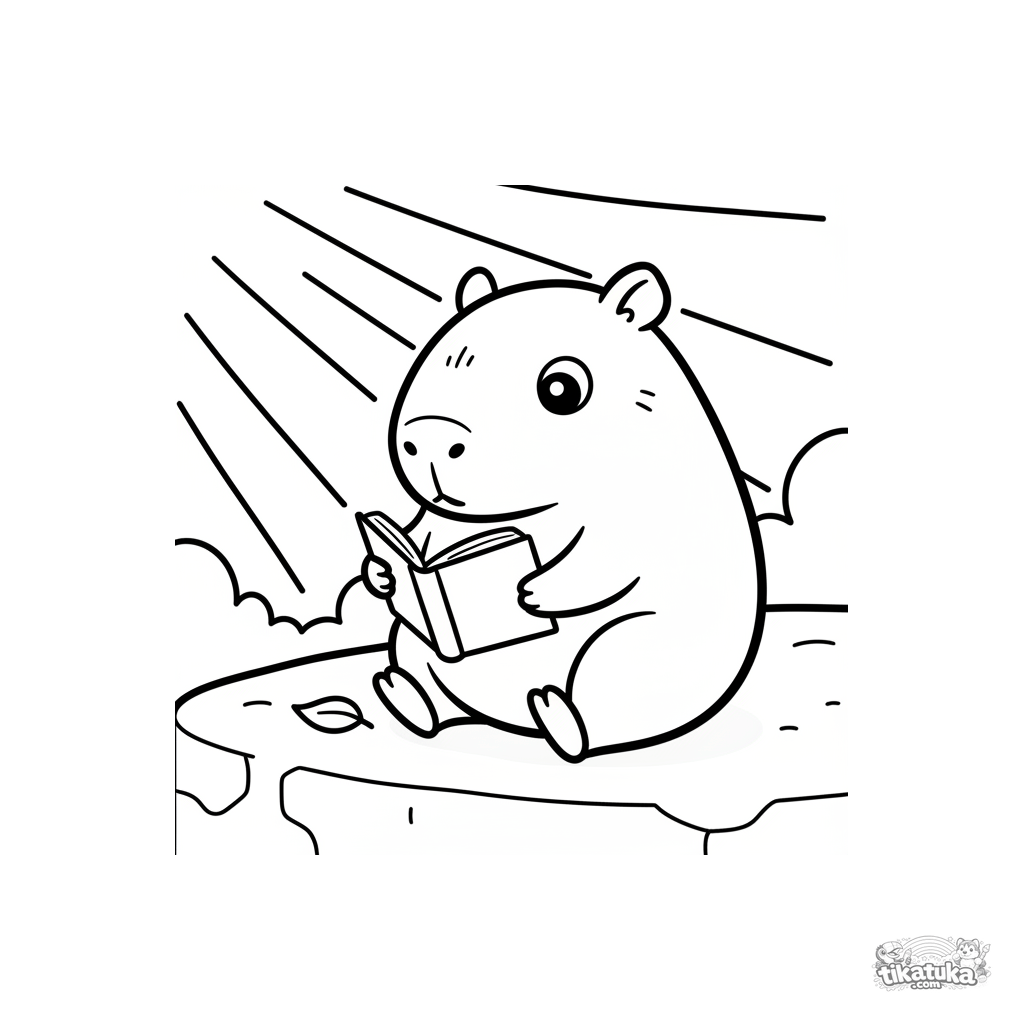 Einfaches Ausmalbild für Kleinkinder von 2-3 Jahren: ein winziges Capybara liest ein Buch bei Sonnenuntergang. Große klare Formen, wenige Details, perfekt für erste Stifte.