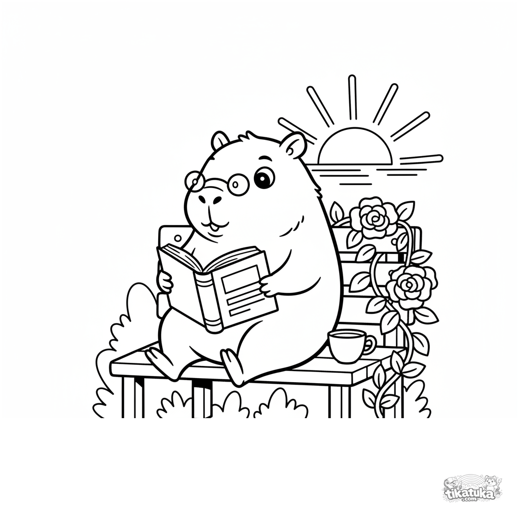 Ausmalbild für Kinder 7-9 Jahre: Ein Capybara mit Brille liest ein Buch auf einer Gartenbank bei Sonnenuntergang. Gemütliche Szene mit Details.