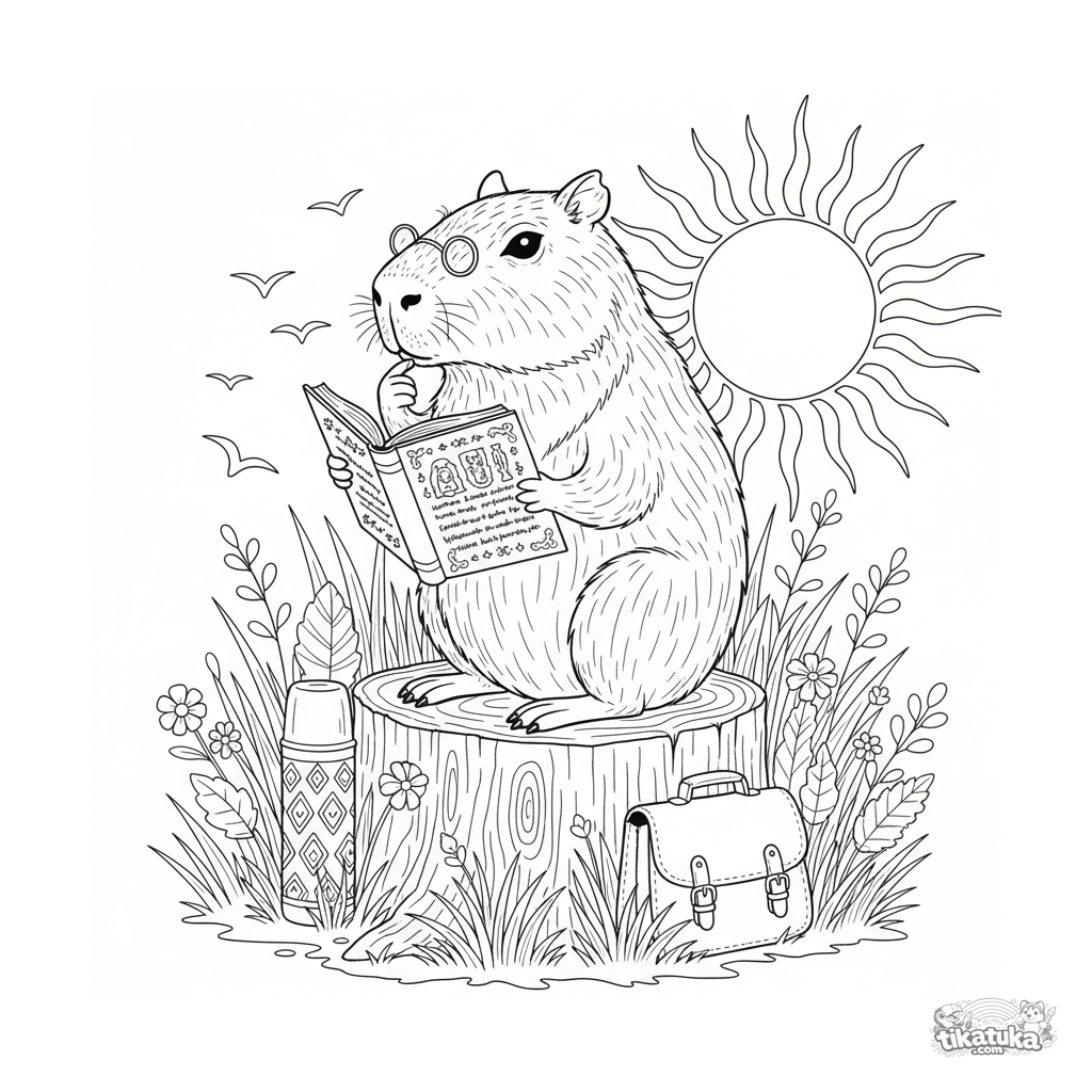 Detailliertes Ausmalbild für Kinder 10-12: ein Capybara mit Brille liest ein Buch auf einem Baumstumpf bei Sonnenuntergang. Szene für Detail-Liebhaber.