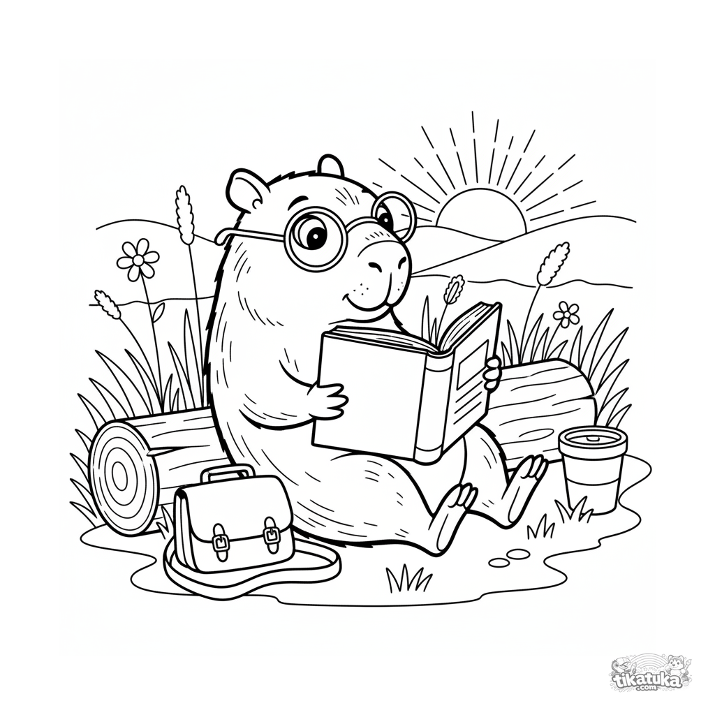 Ausmalbild für Kinder von 7-9 Jahren: ein Capybara mit Brille liest ein Buch im Schein der untergehenden Sonne.