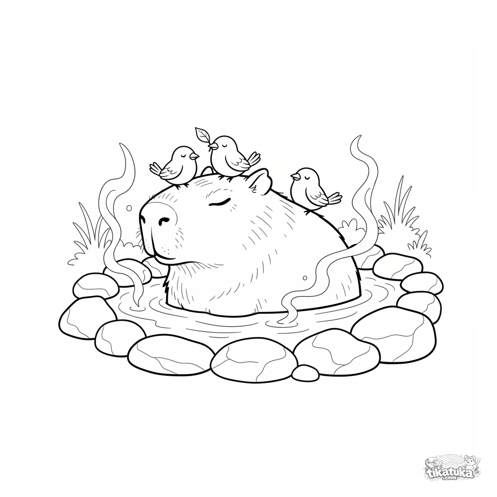 Detailliertes Ausmalbild für Kinder 7-12: ein Capybara entspannt in einer warmen Naturquelle, kleine Vögel sitzen friedlich auf seinem Rücken und Kopf.