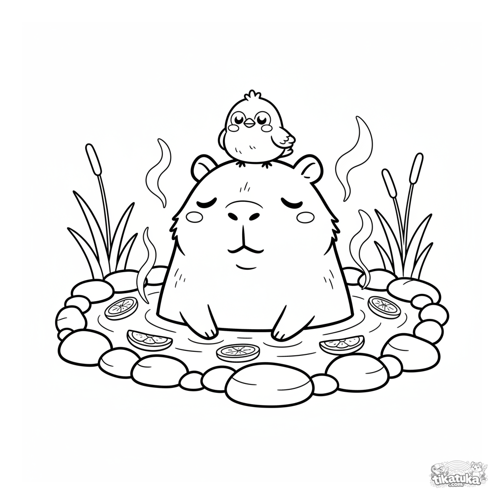 Ausmalbild für Kinder 4-6: ein friedliches Capybara genießt ein Bad in einer warmen Quelle, mit Orangenscheiben auf dem Wasser und einem kleinen Vogel auf dem Kopf.