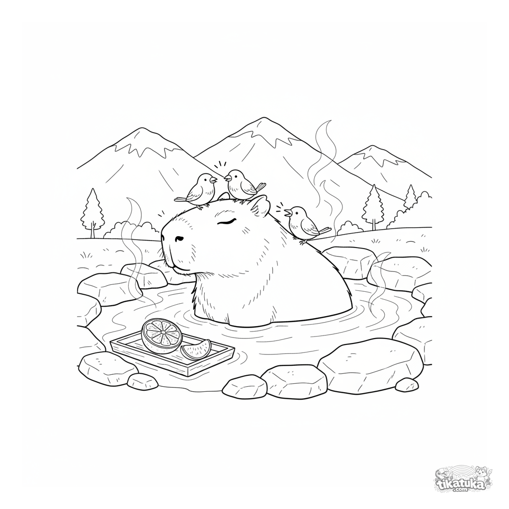 Ein Ausmalbild zum Thema Capybaras und Entspannung mit Detailgrad Mittel. Es passt für das Alter 4-6 Jahre, lässt sich gut zu Hause drucken und sofort online öffnen.