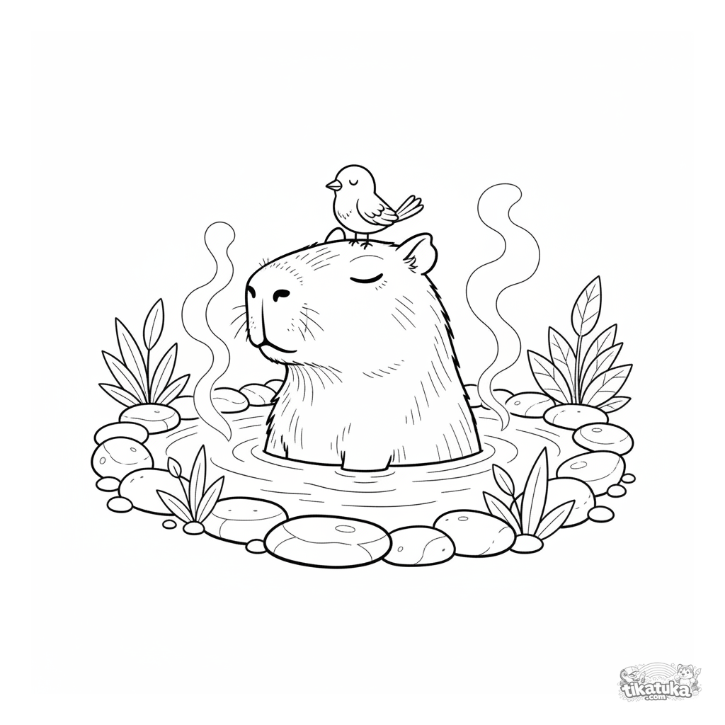 Ruhiges Ausmalbild für Kinder: Ein Capybara entspannt in einer Thermalquelle, ein kleiner Vogel sitzt auf seinem Kopf. Friedliche Szene mit Naturdetails.