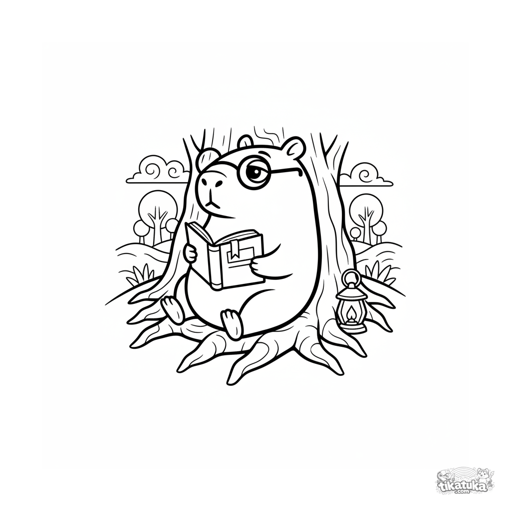 Ausmalbild: Ein Capybara mit Brille liest ein Buch in einer gemütlichen Nische, lässt sich aber vom schönen Sonnenuntergang ablenken. Holzspielzeug-Stil für Kinder von 4-6 Jahren.