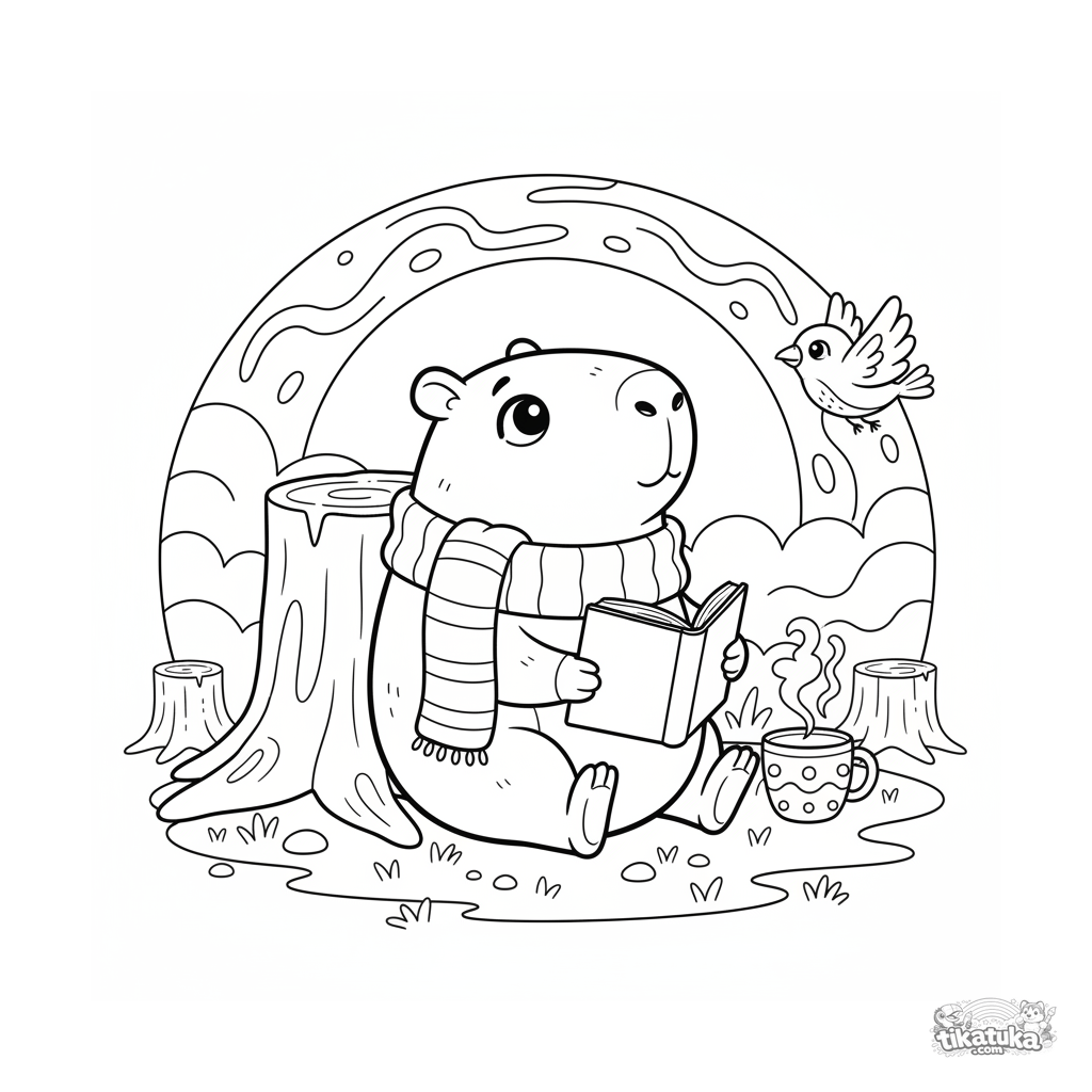 Ausmalbild für Kinder 4-6: Ein gemütliches Capybara mit Schal liest ein Buch, wird aber von einem schönen Sonnenuntergang abgelenkt. Einfache, süße Szene.