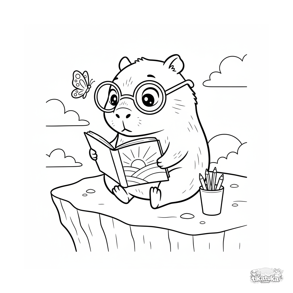 Ausmalbild für 4-6 Jahre: Ein Capybara mit Brille zeichnet den Sonnenuntergang in ein Skizzenbuch, während es auf einer Klippe sitzt. Niedlicher Anime-Stil, klare Formen.