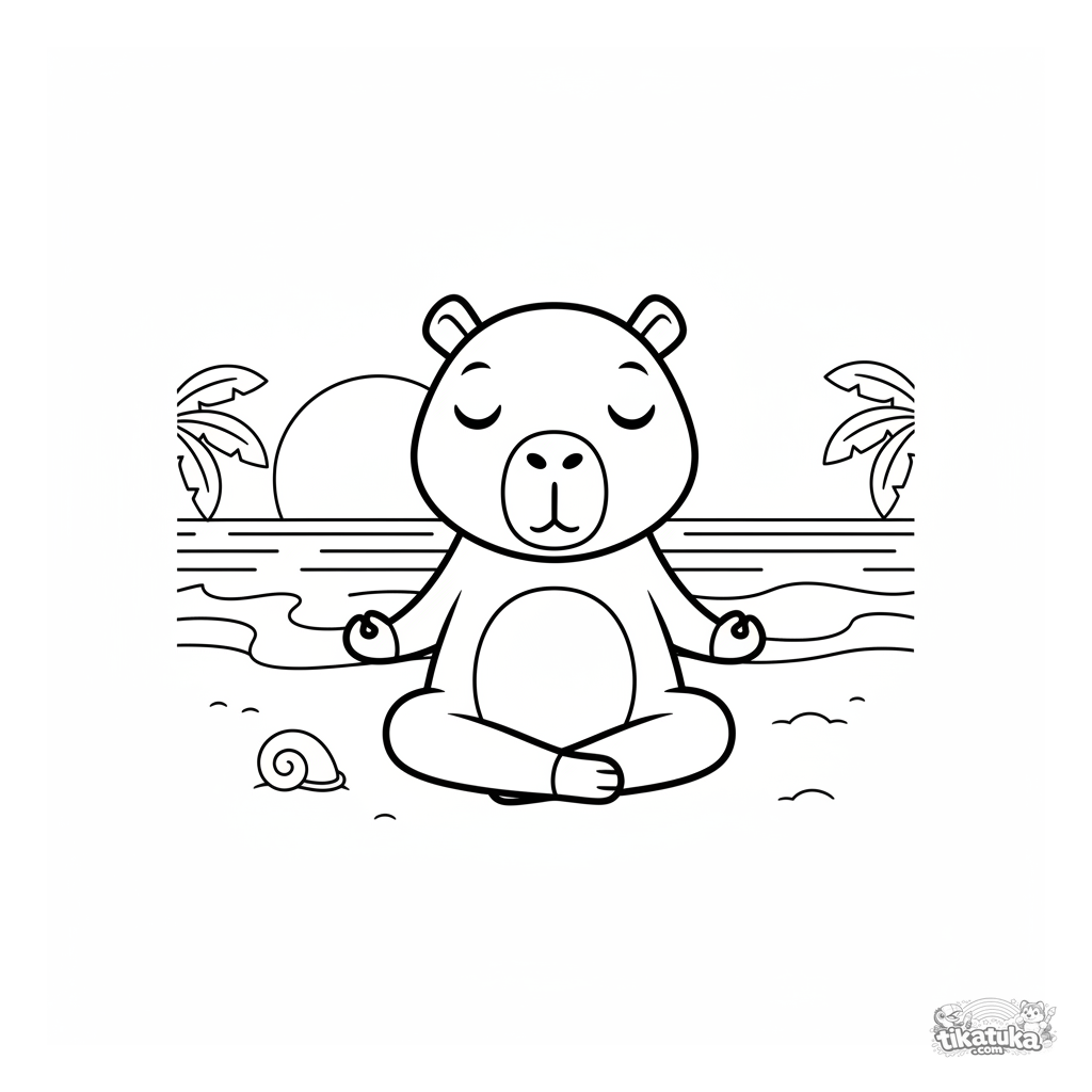 Ausmalbild für Kinder 7-9: Ein ruhiges Capybara praktiziert Yoga an einem einsamen Strand bei Sonnenuntergang.