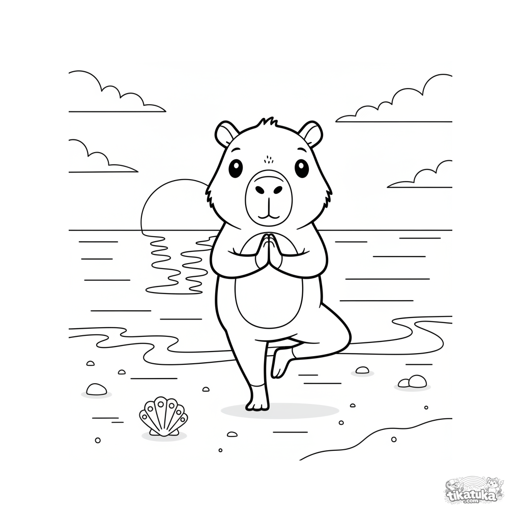 Kinder-Ausmalbild: Ein Capybara in einer Yoga-Pose am Strand begrüßt den Sonnenuntergang. Für Kinder von 4-6 Jahren. Einfache Szene mit Strand und Ozean.