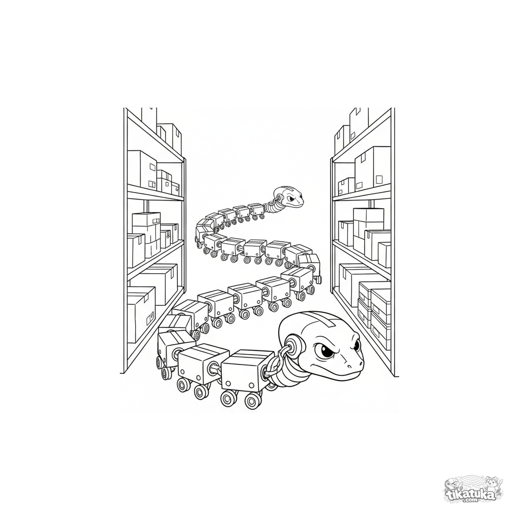 Ausmalbild für Kinder 4-6: Ein langer, segmentierter schlangenartiger Roboter transportiert Fracht durch einen schmalen Lagerhausgang. Saubere Linien, Feldhandbuch-Illustrationsstil, klare Formen.