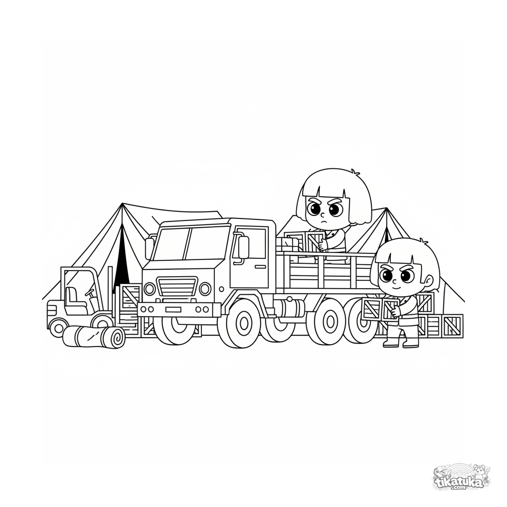 Ausmalbild für 7-9 Jahre: Ein Militärlastwagen wird am Feldhauptquartier mit Holzvorkraten beladen. Soldaten arbeiten im Team.