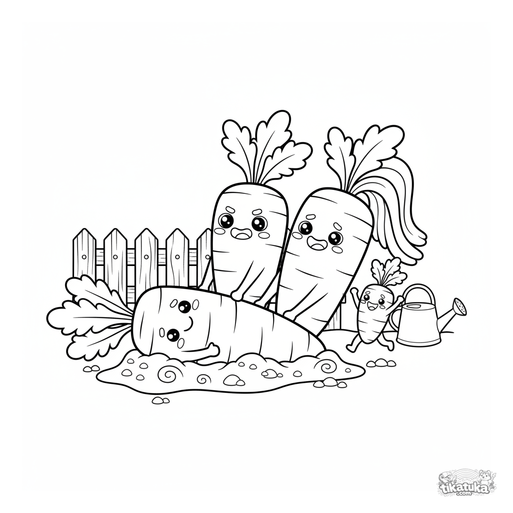 Ausmalbild für Kinder 4-6: eine Karottenfamilie versucht, eine riesige Karotte aus dem Gartenbeet zu ziehen. Niedliche Szene im Storybook-Stil.