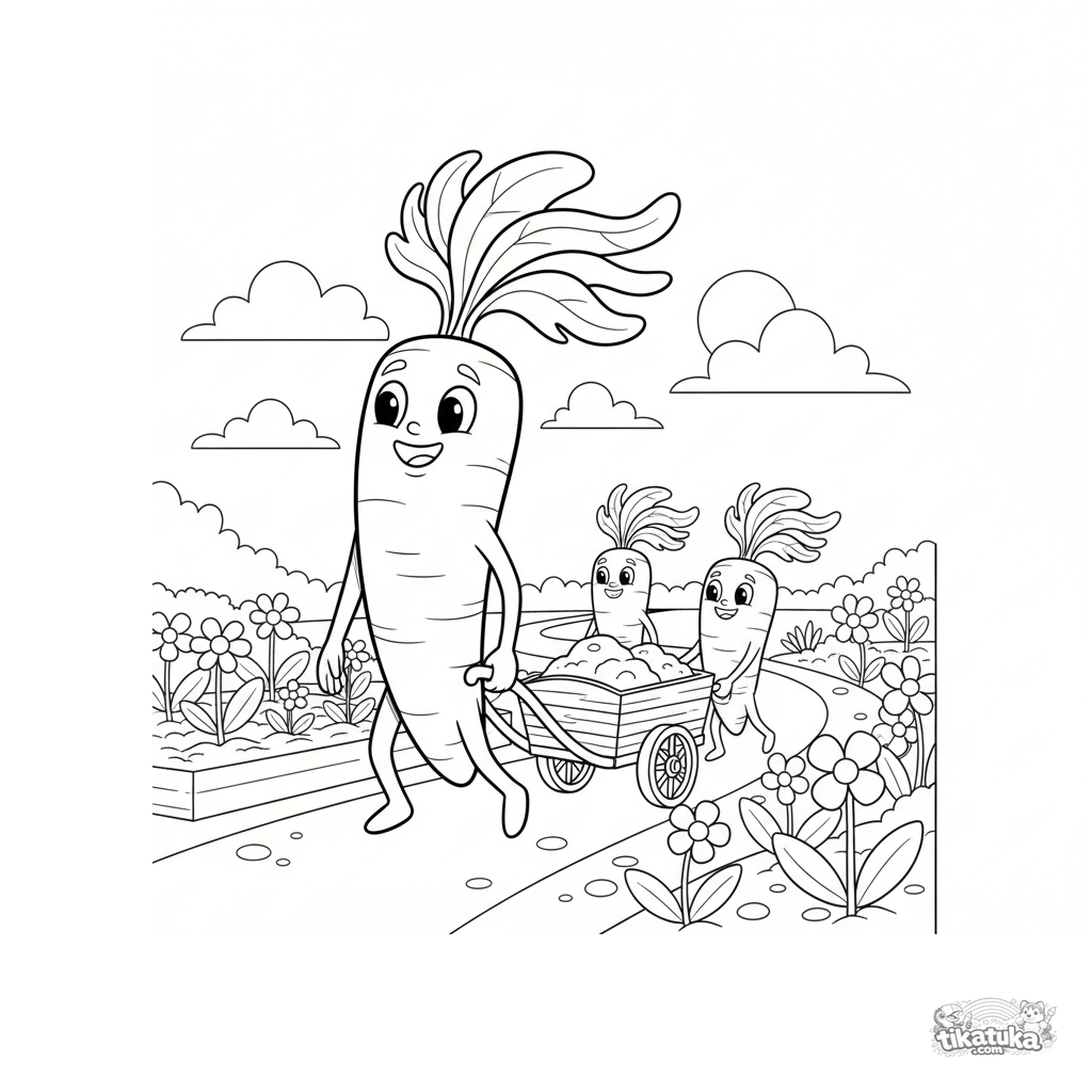 Ausmalbild für Kinder 4-6: eine Karottenfamilie zieht einen Wagen auf einem Gartenweg. Niedliche Szene mit einfachen Details und klaren Formen.