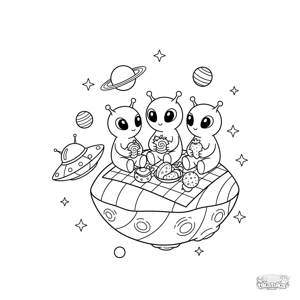 Lustiges Ausmalbild: Eine Alien-Familie macht Picknick auf einem Regenbogen-Asteroiden. Für Kinder von 4-6 Jahren. Raumschiff, Sterne und seltsame Weltraumfrüchte.