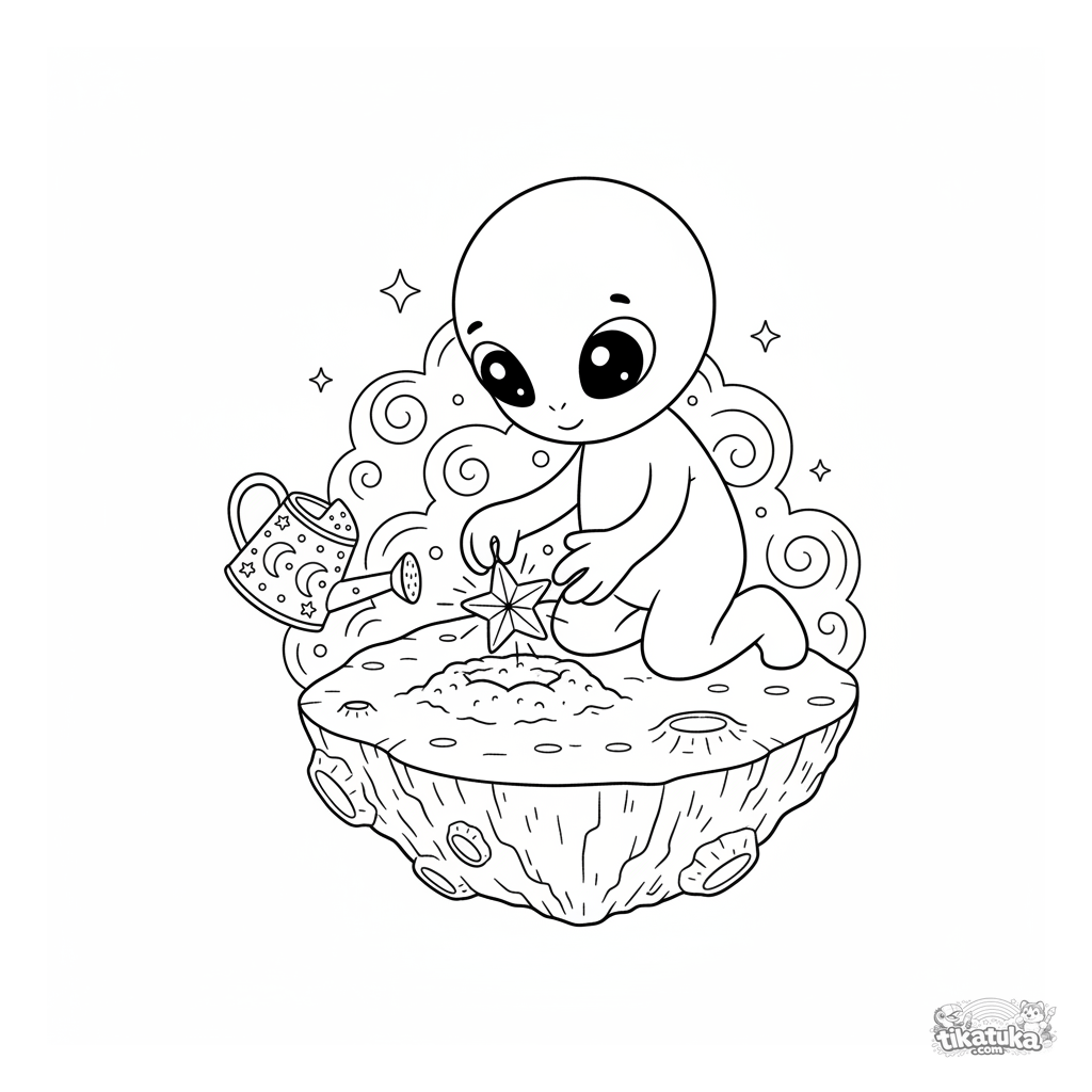Ausmalbild eines freundlichen Cartoon-Alien, das leuchtende Samen auf die Oberfläche eines kleinen Asteroiden im Weltraum pflanzt. Für Kinder von 4 bis 6 Jahren.