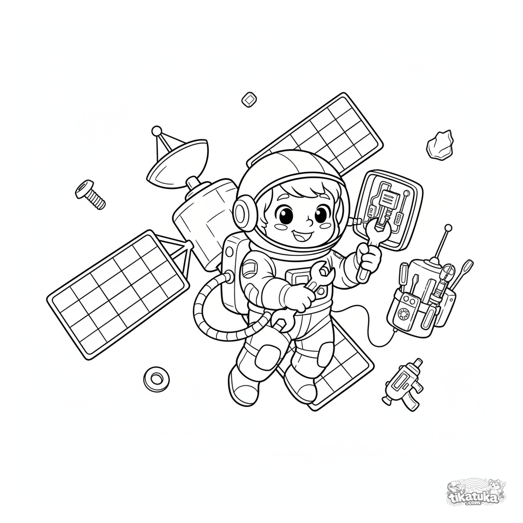 Ausmalbild eines Astronauten im Weltall, der einen Satelliten mit Werkzeugen repariert. Für Kinder von 5-8 Jahren. Einfacher weißer Hintergrund zum Ausmalen.