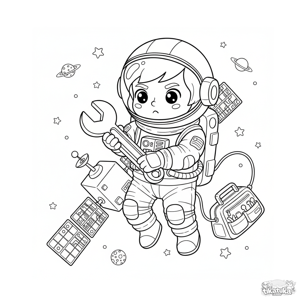 Ausmalbild eines Astronauten, der einen Satelliten im Weltall repariert. Für Kinder von 6-9 Jahren. Detailliertes Bild von Raumanzug und Werkzeugen.