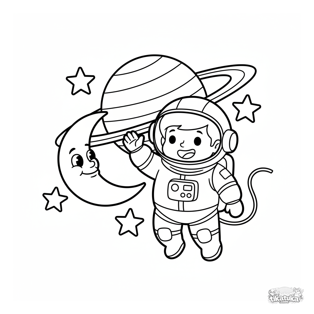 Ausmalbild für Kleinkinder 2-3: Ein Astronaut im Weltraum nahe einem Planeten. Sehr einfache, große Formen, minimales Detail für einfaches Ausmalen.